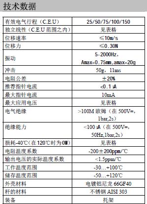 GEFRAN杰弗倫PY1直線位移傳感器,電器可選電纜線以及街頭等連接方式。采用外置式拉桿設計萬向節安裝方式。量程50~150mm、獨立線性度±0.5%、防護等級IP65、位移速度>5m/S、最大供電電壓60vdc、重復性0.01mm、本質無線分辨率。GEFRAN PY1直線位移傳感器使用環境溫度-30~100°C、殼體材料使用不銹鋼材質、電阻公差±20%。GEFRAN PY1直線位移傳感器內部碳膜電阻涂層,配合電刷滑動實現電阻變化,從而轉換為位移量。
